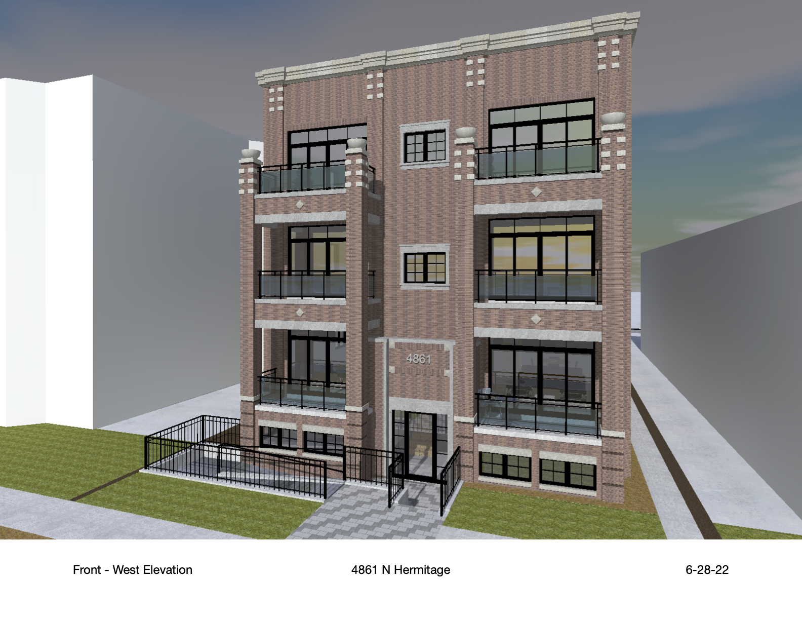 - [outdated rendering] From 47th Ward Alderperson's Matt Martin's website: The existing building is a two-unit building located on a double lot owned by the applicant. The applicant is seeking a zoning change to RT-4A, a specific zoning designation that allows the construction of ADA-accessible buildings. This building would stand 38' tall and contain 6 condo units (4x3-bedrooms and 2x4-bedrooms), 6 car spaces, and 12 bike parking spaces. Two of the units (and 2 parking spaces) would be fully ADA-accessible, and the building would contain an elevator. The units would sell for $600,000 (simplexes) and $750,000 (duplexes).