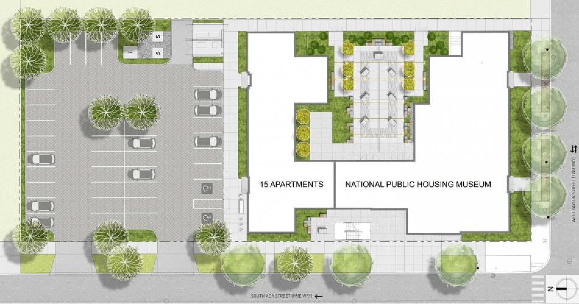 This image represents an image or PDF that was given the description: A redevelopment of the only remaining Jane Addams Homes building, which will be used for the National Public Housing Museum. It will also have 15 apartments ad 37 car parking spaces.