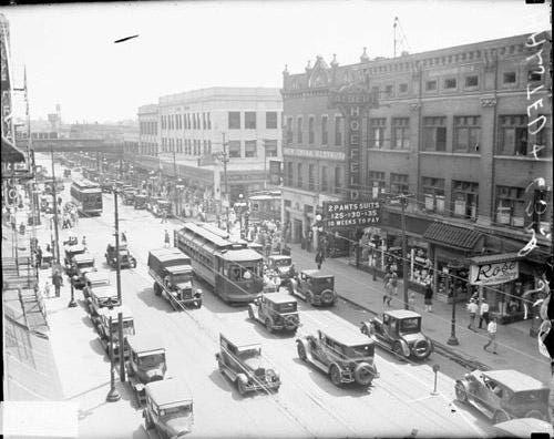 Retail buildings in Halsted, at or near the intersection of Halsted Street and 63rd Street. The vintage photograph was taken in 1929. Photographers, clockwise from top-left: Noah Vaughn, Jeff Zoline, Chicago Daily News photographer, Noah Vaughn